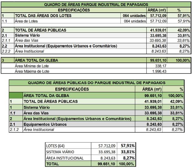 • Áreas Públicas: 41.939,01 m² (42,09%) para Sistema Viário e Área Institucional.